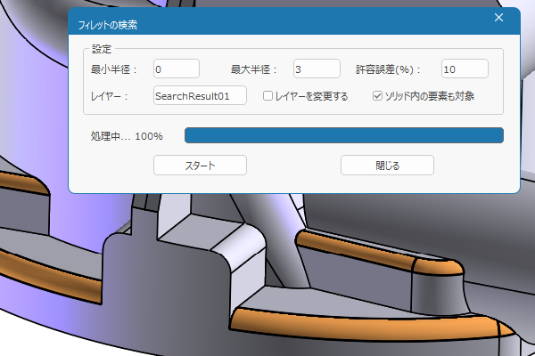 このコマンドを使って、例えば、最小半径を 0、最大半径を 3 等と指定すると、半径 3 mm 以下のフィレットのみ取り出す(選択する)ことができます。